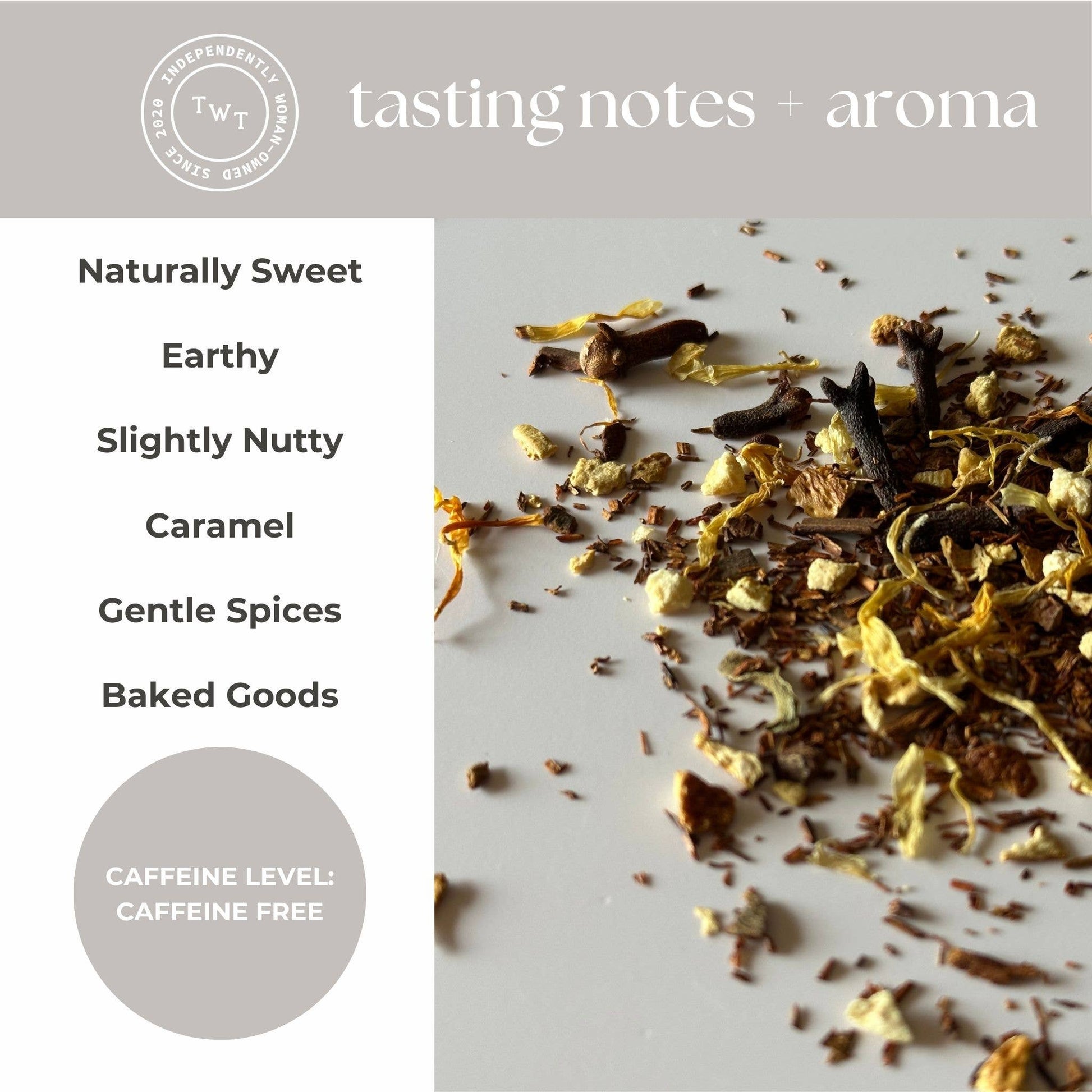 BAKESHOP BLISS (CAFFEINE-FREE): Step inside our Christmas bakery and enjoy this cozy caffeine-free mix of spices, marigold petals, orange peel, vanilla, and rooibos. This holiday tea evokes the aroma of freshly baked cookies and festive treats straight from the oven. Perfect for creating moments of holiday cheer.