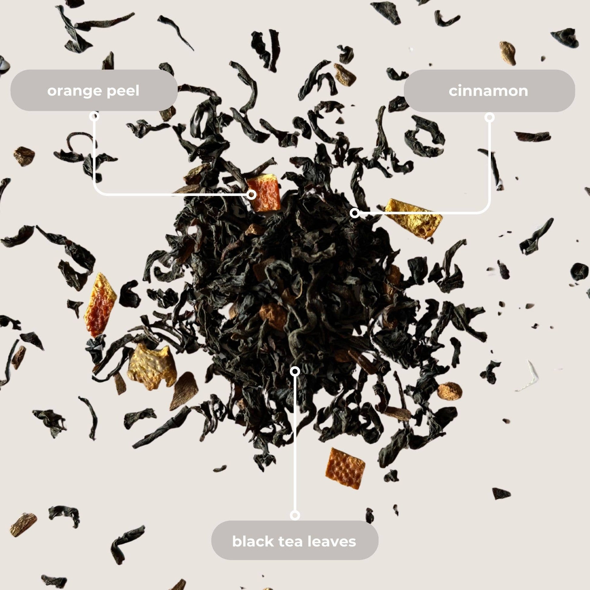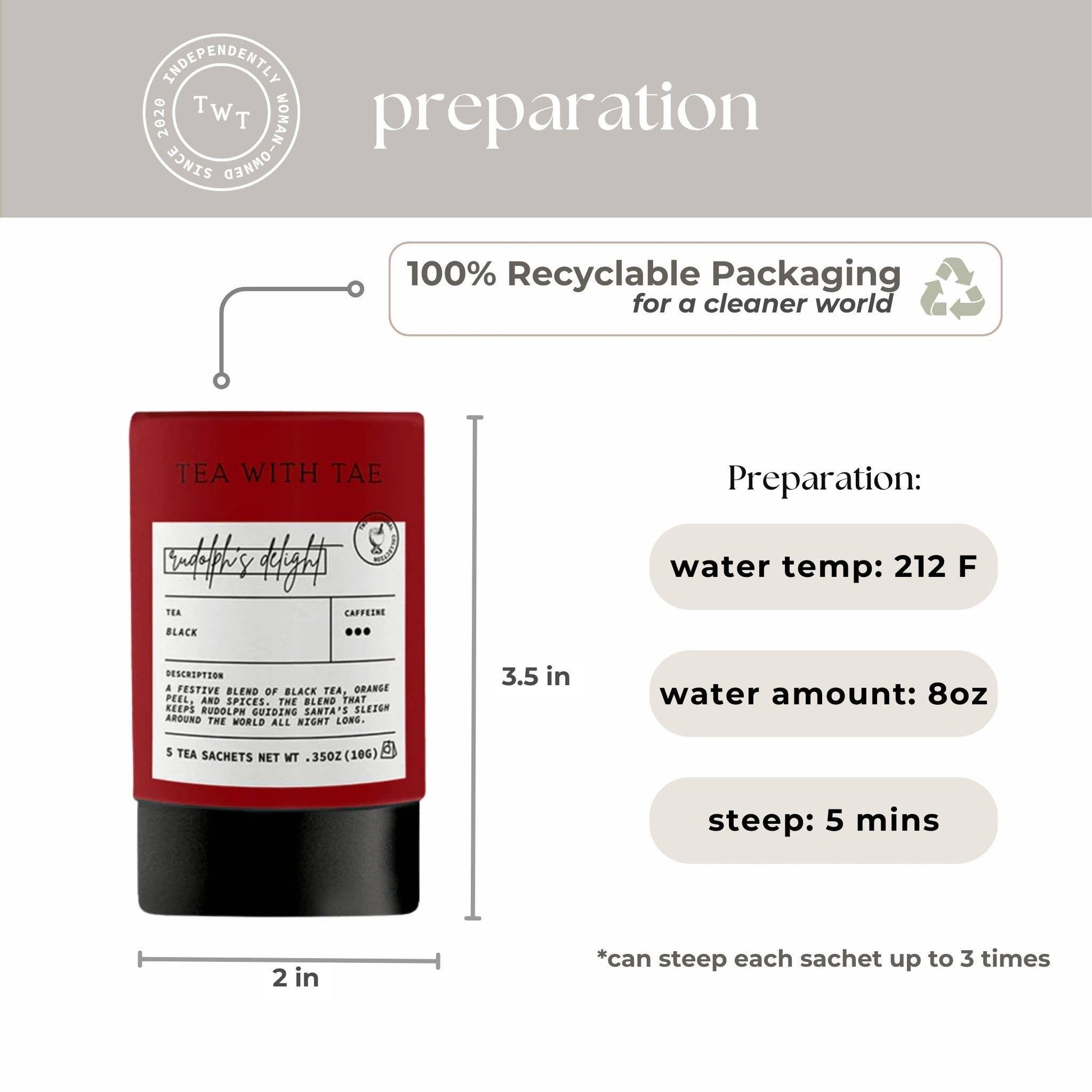 RUDOLPH'S DELIGHT: Our take on a hot cinnamon spice blend made with lots of black tea, cinnamon, and orange peel. This is the tea that keeps Rudolph guiding Santa's sleigh around the world all through the night!